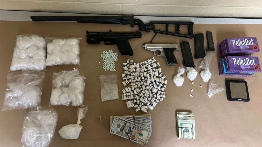 During the search, authorities allegedly recovered bricks of fentanyl, 1,200 fentanyl pills, 10.5 ounces of crack cocaine, and other substances, as well as two firearms and a shotgun.