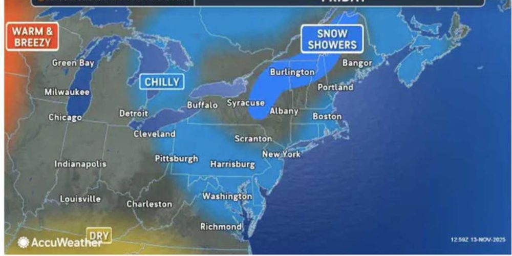 AccuWeather experts predict that rain showers will turn into snow showers in Ohio, West Virginia, Pennsylvania, and New York, with lake-effect snow developing Sunday through Monday, November 17.