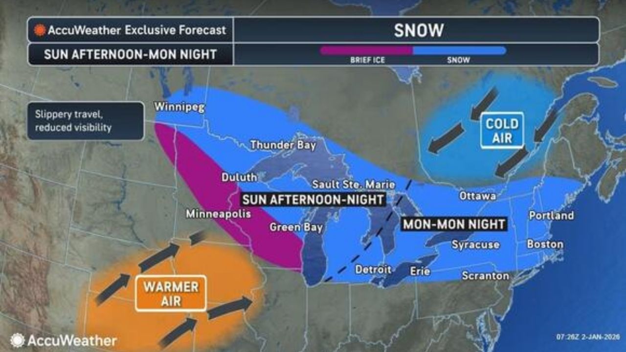 As slightly warmer air moves in late Sunday, Jan. 4 into Monday, Jan. 5, snow is predicted across much of New York, northern New Jersey, and Pennsylvania, as well as New England, with freezing rain further south.